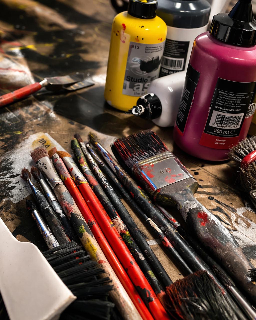Mit jeder Farbschicht giesse ich Gewicht auf die Fläche, Farbe, die sich schwer und warm ausbreitet, die nach Metall riecht und weich über die Strukturen fliesst. Sie sammelt sich, verdichtet sich, flüstert in satten Tönen. Immer wieder breche ich diese Schichten auf, arbeite neue Risse und Erhebungen hinein, als würde ich in ein noch atmendes Gewebe greifen. Das Bild beginnt zu pulsieren, ein leises, vibrierendes Leuchten, das sich hören lässt wie ein ferner, tiefer Ton.