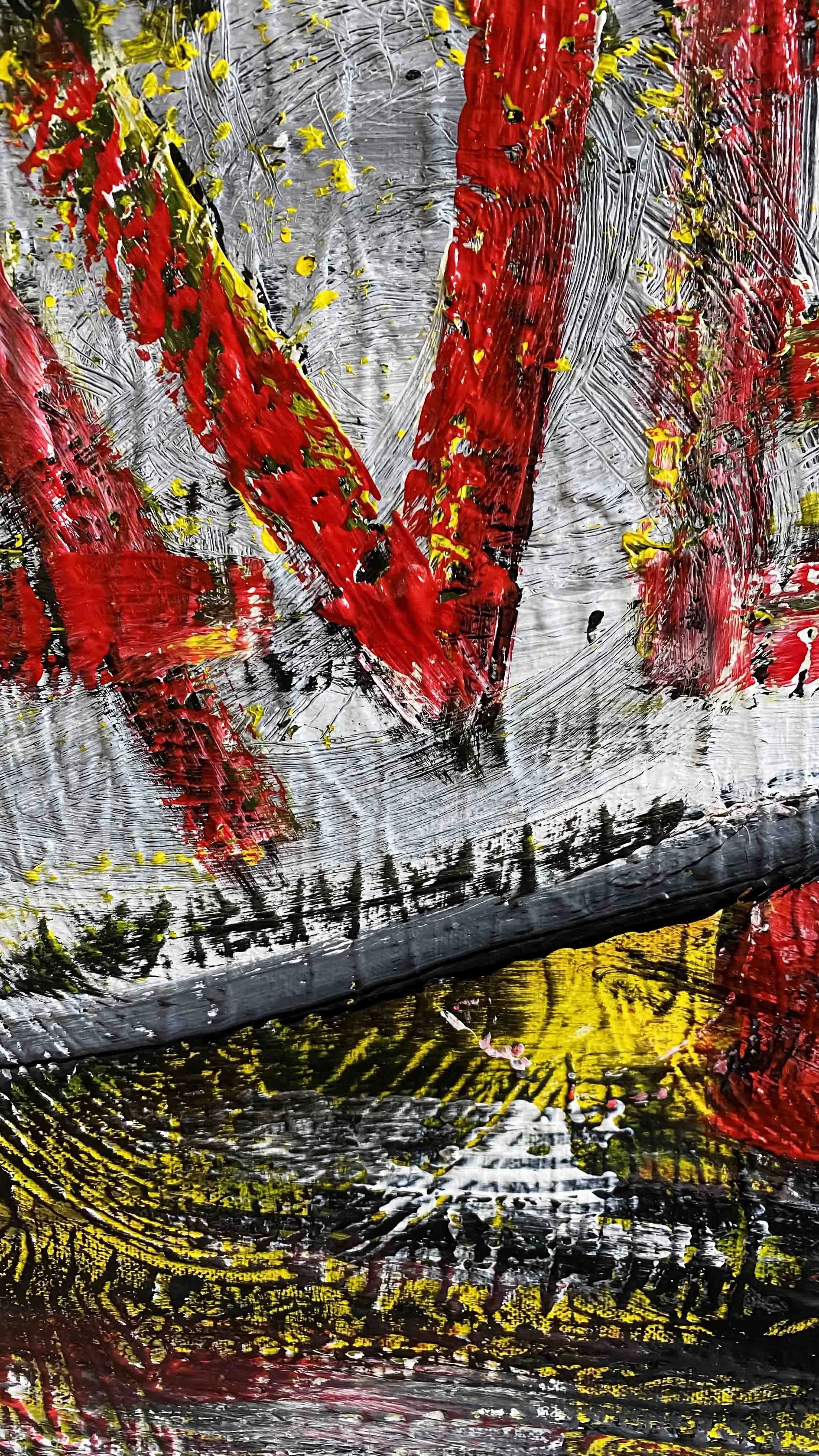 Das Schichten und Verdichten trägt eine eigentümliche Spannung in sich: Die Oberfläche beginnt sich zu bewegen, nicht sichtbar im klassischen Sinn, sondern spürbar wie ein warmer Luftzug auf der Haut. Im Detail entfaltet sich ein dichtes Geflecht, ein fliessendes Durcheinander aus Farbe, Struktur und Richtung. Es ist ein stilles Rauschen, das nicht drängt, nicht schreit, sondern sich wie ein matter Geschmack im Mund ausbreitet: ehrlich, ungefiltert, offen.