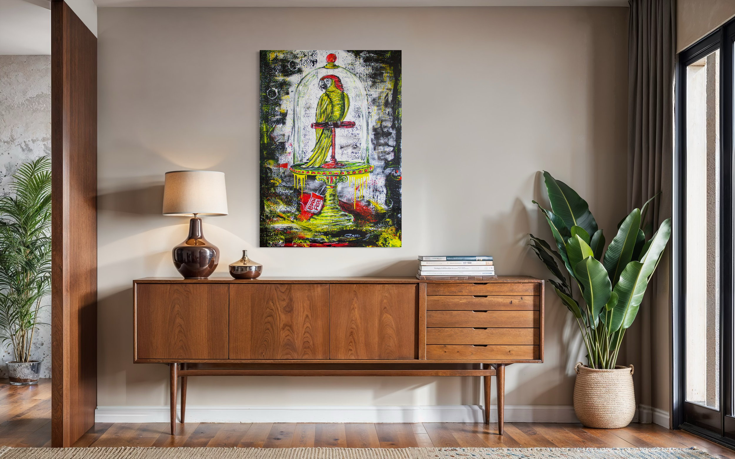 Der Vogel ist nicht einfach gefangen, sondern ästhetisch gefangen. Genau das macht das Bild so unangenehm. Gewalt erscheint hier nicht als rohe Zerstörung, sondern als kultivierte Form. Die Glasglocke wirkt wie Schutz, der Sockel wie Würde, die Farbe wie Feier. Doch genau darin liegt die Spannung: Was wie Ehrung aussieht, ist in Wahrheit Entzug. Der Papagei ist erhöht und zugleich entmächtigt. Er wird gezeigt, aber nicht gelassen. Er darf da sein, aber nicht leben. Und das Schild „Born free“ macht sichtbar, dass hier nicht irgendein Wesen eingesperrt wurde, sondern eines, dessen Wahrheit gerade in der Freiheit liegt. Der Skandal beginnt also nicht erst mit offener Unterdrückung. Er beginnt dort, wo Freiheit gelobt, dekoriert und sprachlich beschworen wird, während ihre Wirklichkeit bereits zerstört ist.