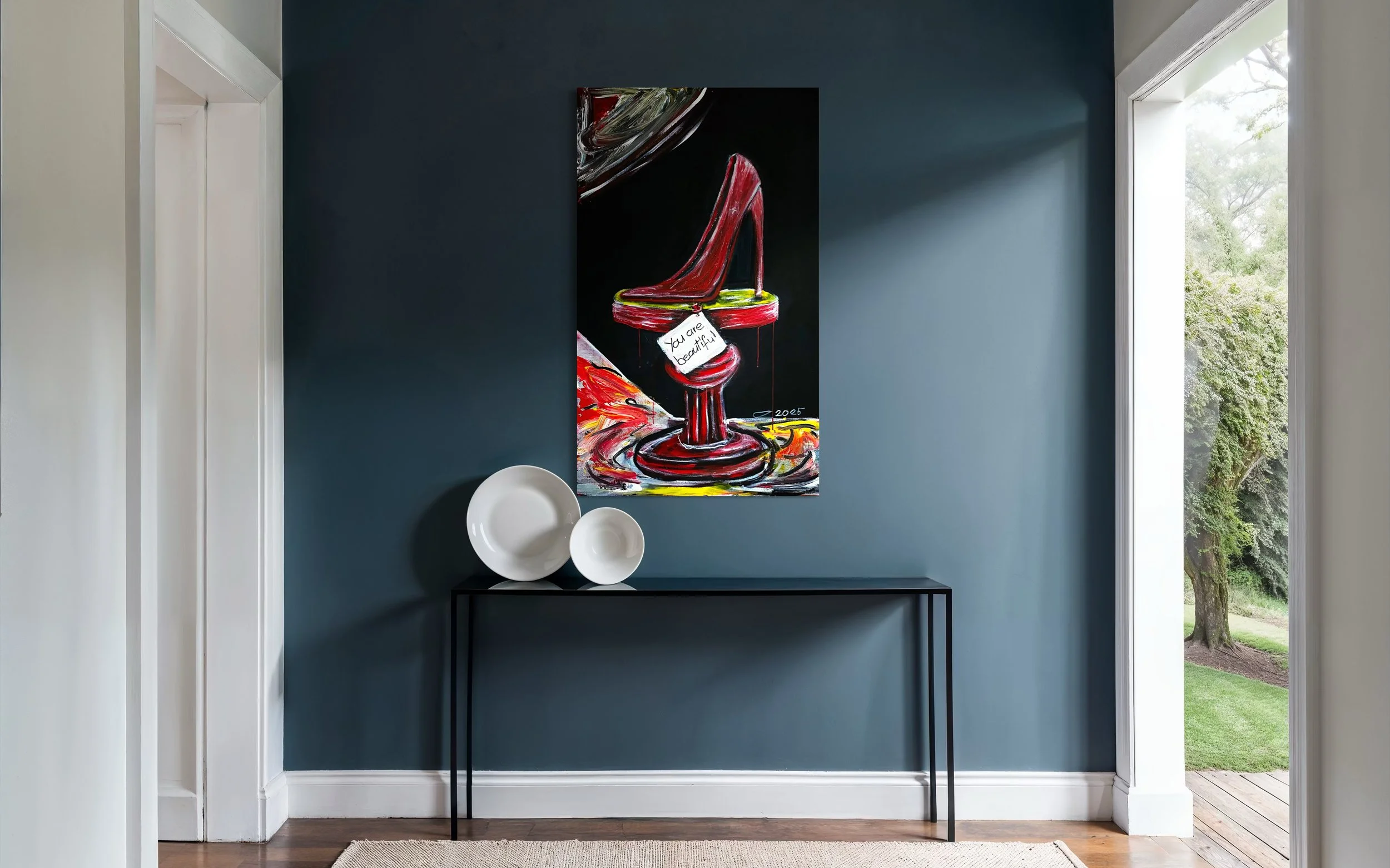 Das kraftvolle "You are beautiful!" hängt an diesem Schuh wie ein kleiner Befreiungsschlag und erregt inmitten der Verwirrung. Diese Aussage ist sowohl ein Mantra als auch eine Provokation. In einer Welt, die dir ständig sagt, dass Schönheit überwiegend der äusseren Erscheinung angehört, ermutigt dich dieses Bild, deinen eigenen Wert neu zu definieren. Aber wie? Sind wir dazu bereit, eine Maske abzulegen und die Furcht zu spüren, die mit der Entblössung der eigenen Wahrheit einhergeht?
