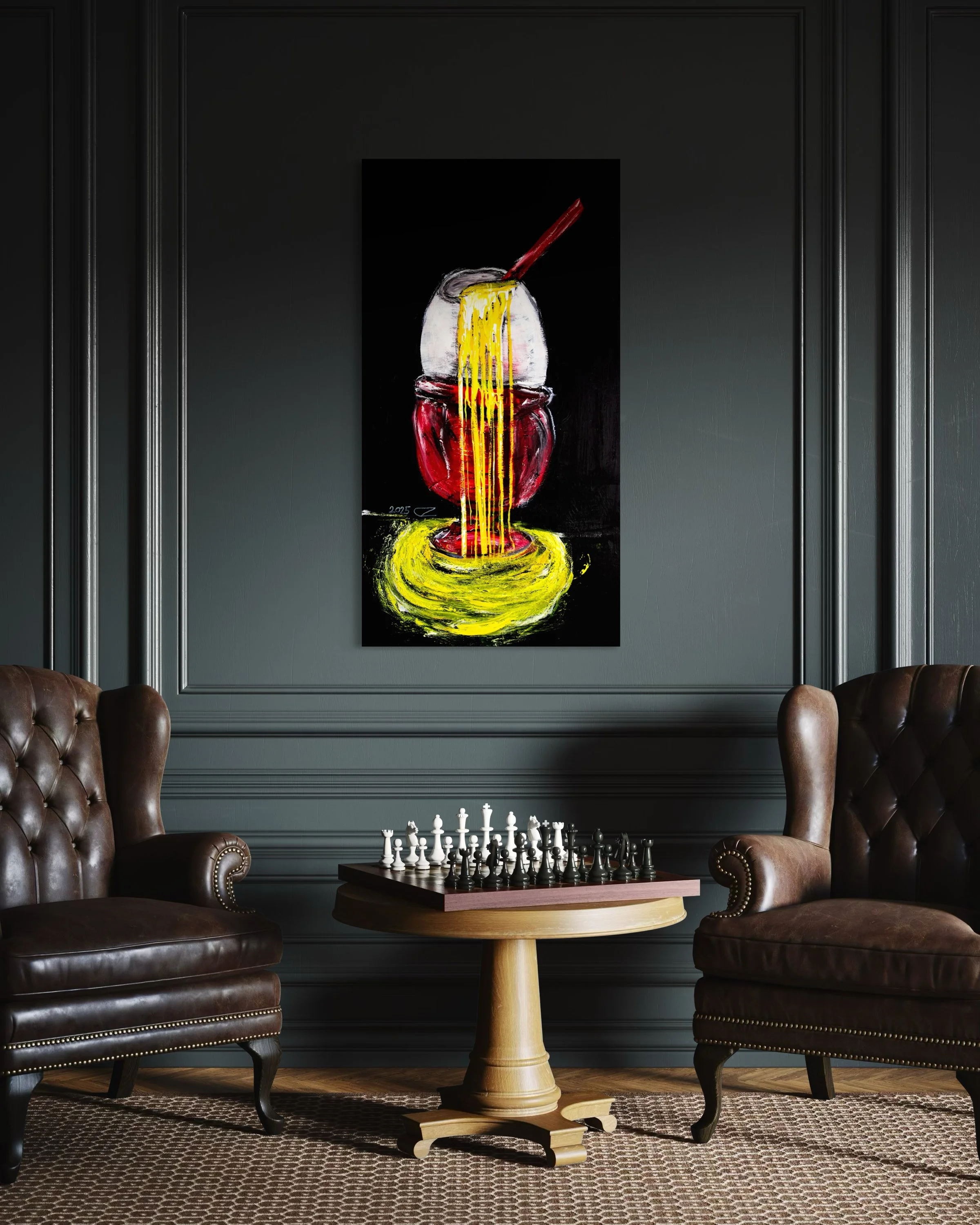 Das Bild hält die Frage fest, ob wir uns entfalten oder nur ablaufen. Der gelbe Guss wirkt wie Lebenssaft, der von oben nach unten muss, als gehorchte er der Gravitation einer fremden Ordnung. Der Kelch nimmt alles auf, gibt nichts zurück; am Sockel zeichnet sich der Kreis, der beginnt, wo er endet.