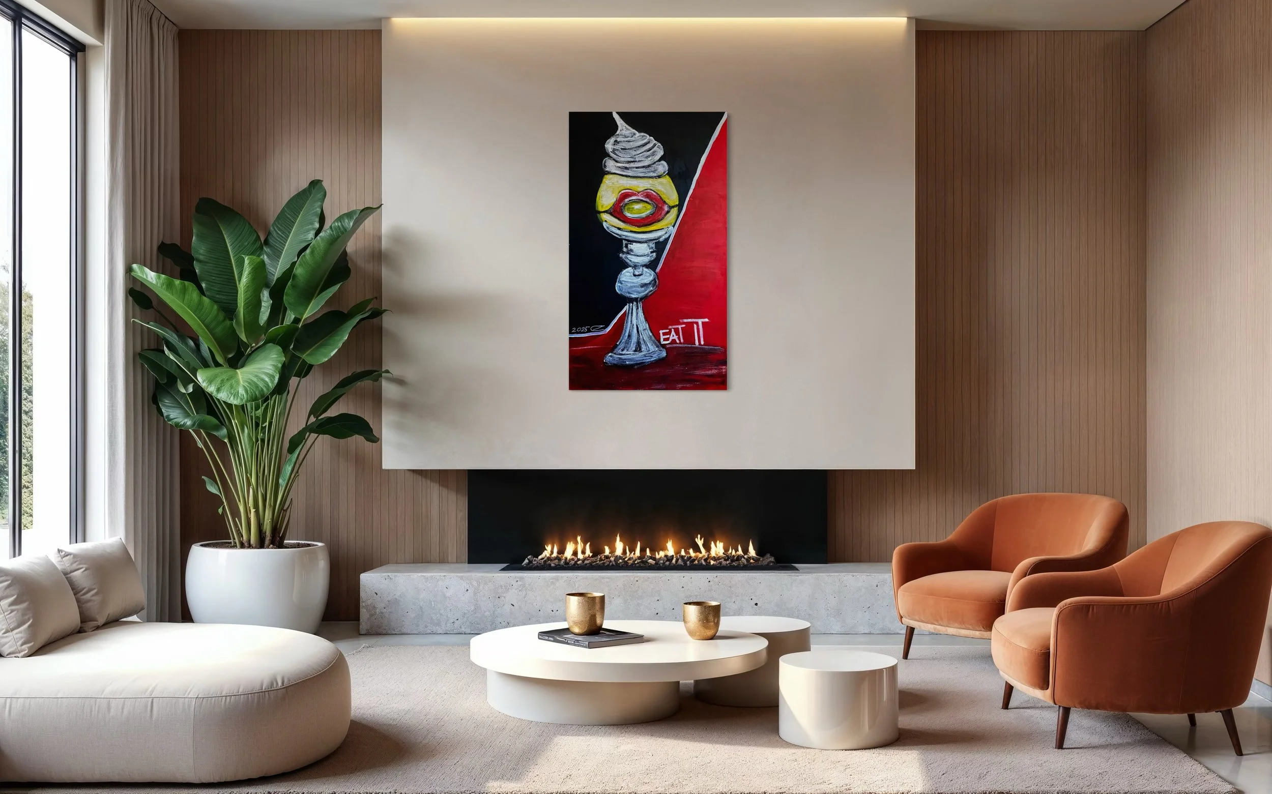 In der Betrachtung des Bildes Lebensmittel oder Körperflüssigkeiten wird dir schnell bewusst, dass du in einem faszinierenden Spannungsfeld stehst. Auf der einen Seite siehst du ein verlockendes Dessert, glänzend und frisch, ein Bild des Genusses. Es ruft den Sinn für Verlangen hervor und es fragt dich direkt: EAT IT! Doch diese Aufforderung hallt in dir nach wie ein Echo, das die Risse in deinem Gesellschaftsbild aufdeckt. Du bist getrieben von der Lust, das Dessert zu kosten, aber gleichzeitig nagt ein Gedanke an dir, was steckt wirklich hinter dieser süssen Verlockung?
